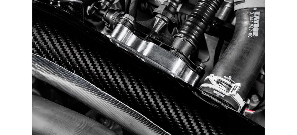 The Mercedes A35 Eventuri Turbo Tube has been developed to provide the turbo with a less restrictive flow path as compared to the stock tube. We have managed to increase the internal volume as well as eliminating the ridged flexible section at the airbox side. By using a completely solid tube all the way from the intake to the turbo, the flow path is smoother and therefore airflow can remain more laminar. To account for engine movement, our A35 intake has a "floating" tube, which can move within the airbox. The shape of the carbon tube at the turbo end has been optimised using CFD to minimise turbulence. The connection to the turbo is achieved with an innovative silicon coupler that features an internal thermal separator between the carbon tube and the metal turbo housing. The multiple breather connectors at the back of the tube are taken care of with a CNC machined block which also provides a smooth internal surface for airflow within the tube.